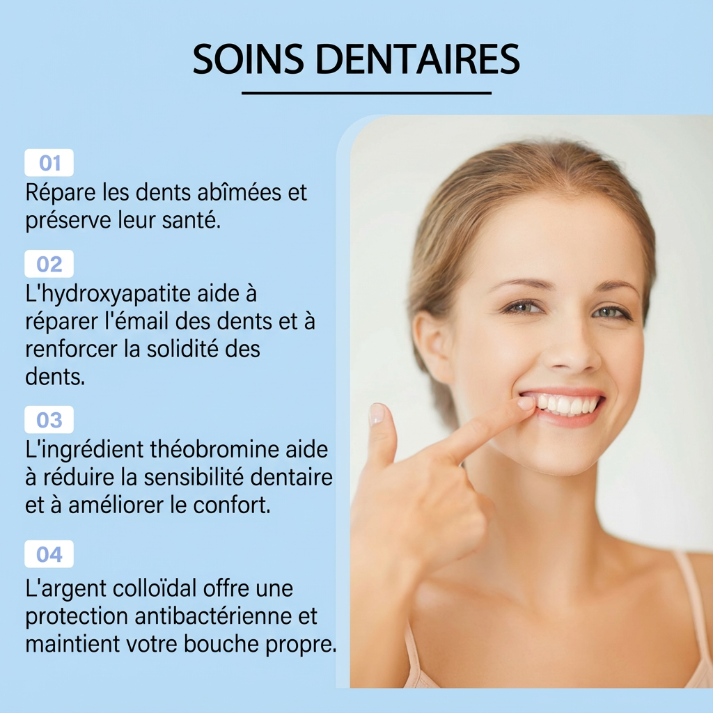 SOIN DENTAIRE COMPLET - Cette formule synergique combine plusieurs ingrédients actifs comme l'Hydroxyapatite et l'Argent Colloïdal pour offrir une protection complète, réparant activement les dommages, renforçant l'émail et assurant une santé et une hygiène bucco-dentaire globale à long terme.